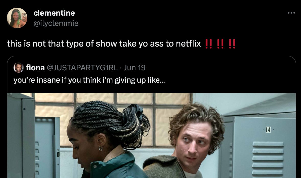 i started watching the TV show The Bear on Hulu expecting a good show. i kept seeing it talked about on twitter and my friends kept asking me if i’d watched it yet because they think the main chef (Carmy) is hot. all i knew about it was that it showed the inner workings of a kitchen and that the two main characters are definitely not in love. as someone who goes through TV shows very slowly, i watched Season 1 in less than a week. Season 1 of The Bear is good. Season 2 of The Bear is great.