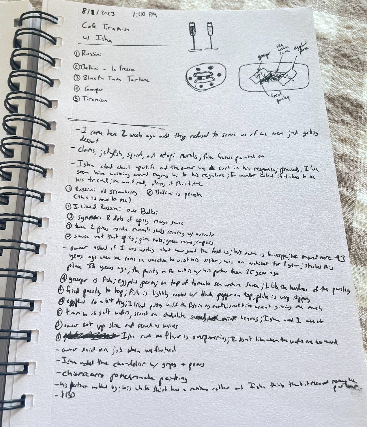 Isha asked about apertifs and the owner was very curt in his response; previously I’ve seen him walking around saying hi to his regulars; I wonder what it takes to be his friend; he wasn’t really doing it this time